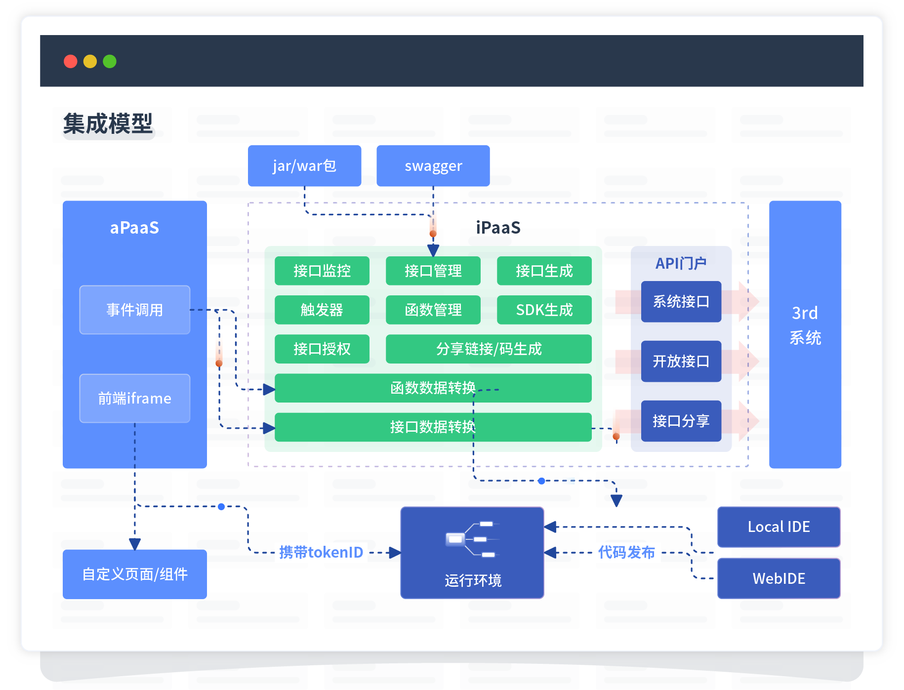 集成模型包括平台本身前、、、后端能力的扩展,,,,也支持通过API门户和第三方系统进行交互。。。