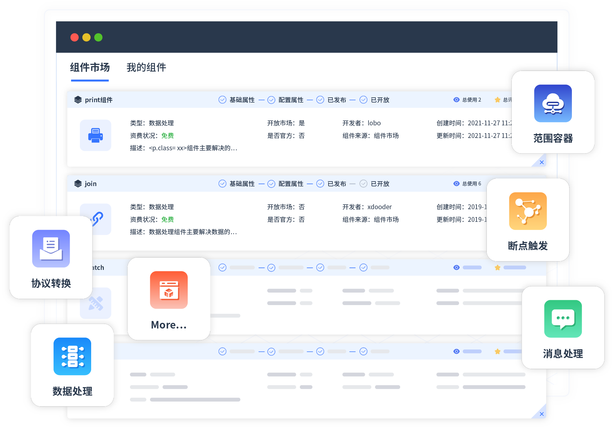 针对集成场景,,,小米钱包提供组件市场,,,例如协议转换、、、消息处理、、、文件操作等。。除平台提供的组件外,,,客户可以自定义所需组件。。