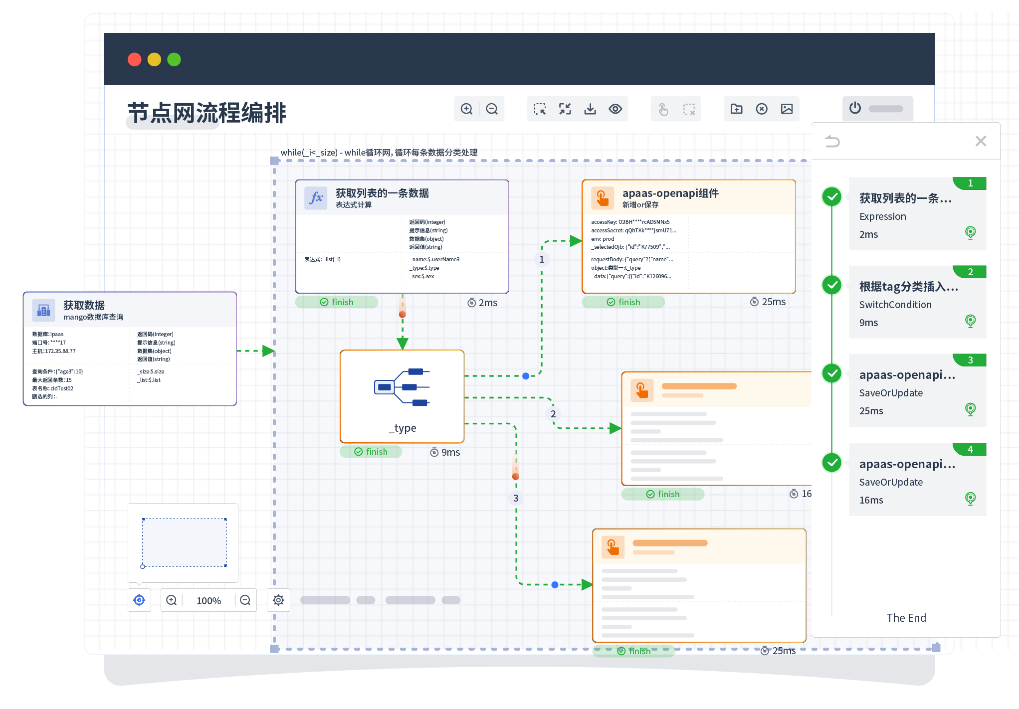针对集成场景,,,,组件定义后支持进行流程编制,,不同于传统代码方式,,,通过图形化展示,,,,支持在线调试、、、、日志查看和运行回放。。。。