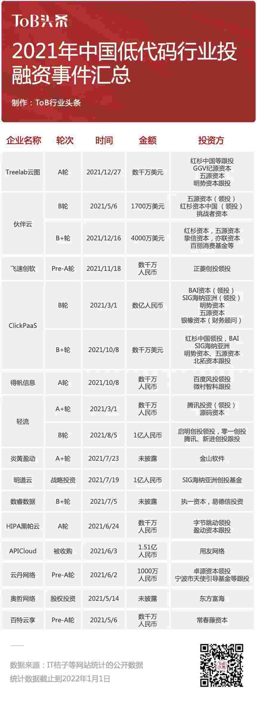 到2021年,,,,无/低代码投融资规模势头更甚,,,,其中包括轻流两轮融资(A+轮数千万人民币,,,,B轮近亿人民币)、、、小米钱包 两轮融资(B轮数亿人民币,,,,B+轮数千万美元)、、百特云享数千万元Pre-A轮融资......